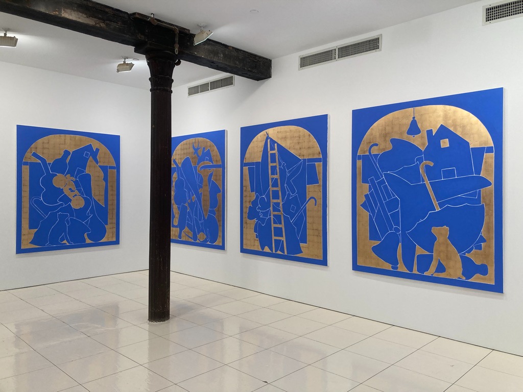 Salman Rushdie was at this opening. As was New York-based artist Ford Crull based on that headline photo — hi Ford! But Italian artist Francesco Clemente’s latest work is meant best for precisely this setting: a pristine room with a bench at its center. From there, over a dozen works of uniform size, style, and palate surround the viewer, presumably searching for the compositional details between each piece at their own pace — and drawing their distinct conclusions from it. Rich blue pigments and gold leaf on panel lend a purposeful visual pleasure, “a sort of sublime defiance of the dark times in which we live, a retort to their unrelenting illusions of ‘progress,’” per the press release. Through May 20.